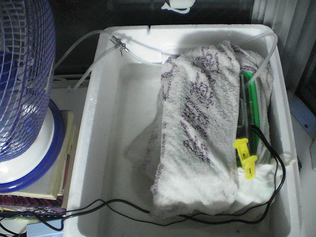 全体にタオルを巻いて、気化熱で冷やすようにした。